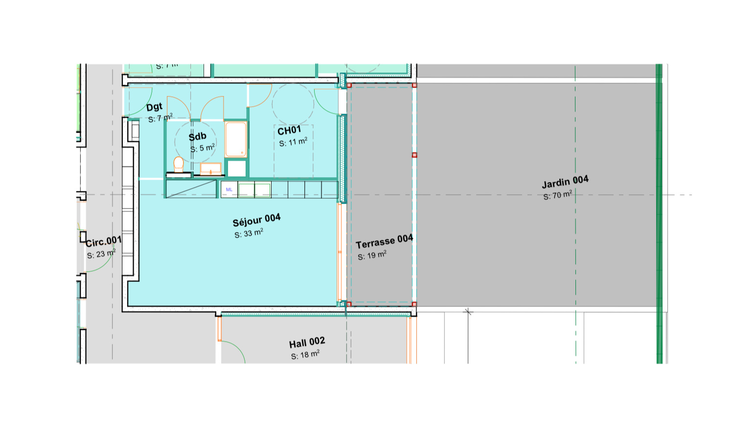Le bien offre une belle pièce de vie d'environ 33 m2 lumineuse avec une baie vitrée en aluminium donnant sur la terrasse, d'une cuisine américaine, d'une chambre avec placard, d'une salle de bains et d'un WC suspendu.