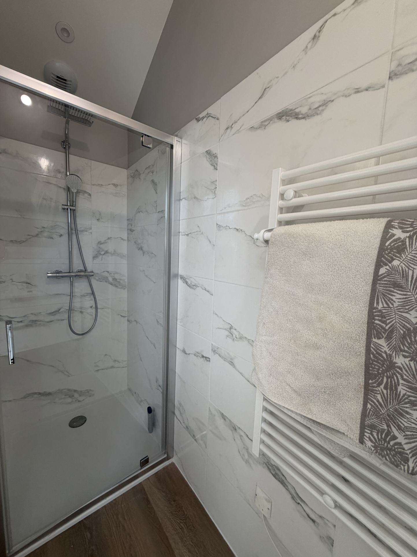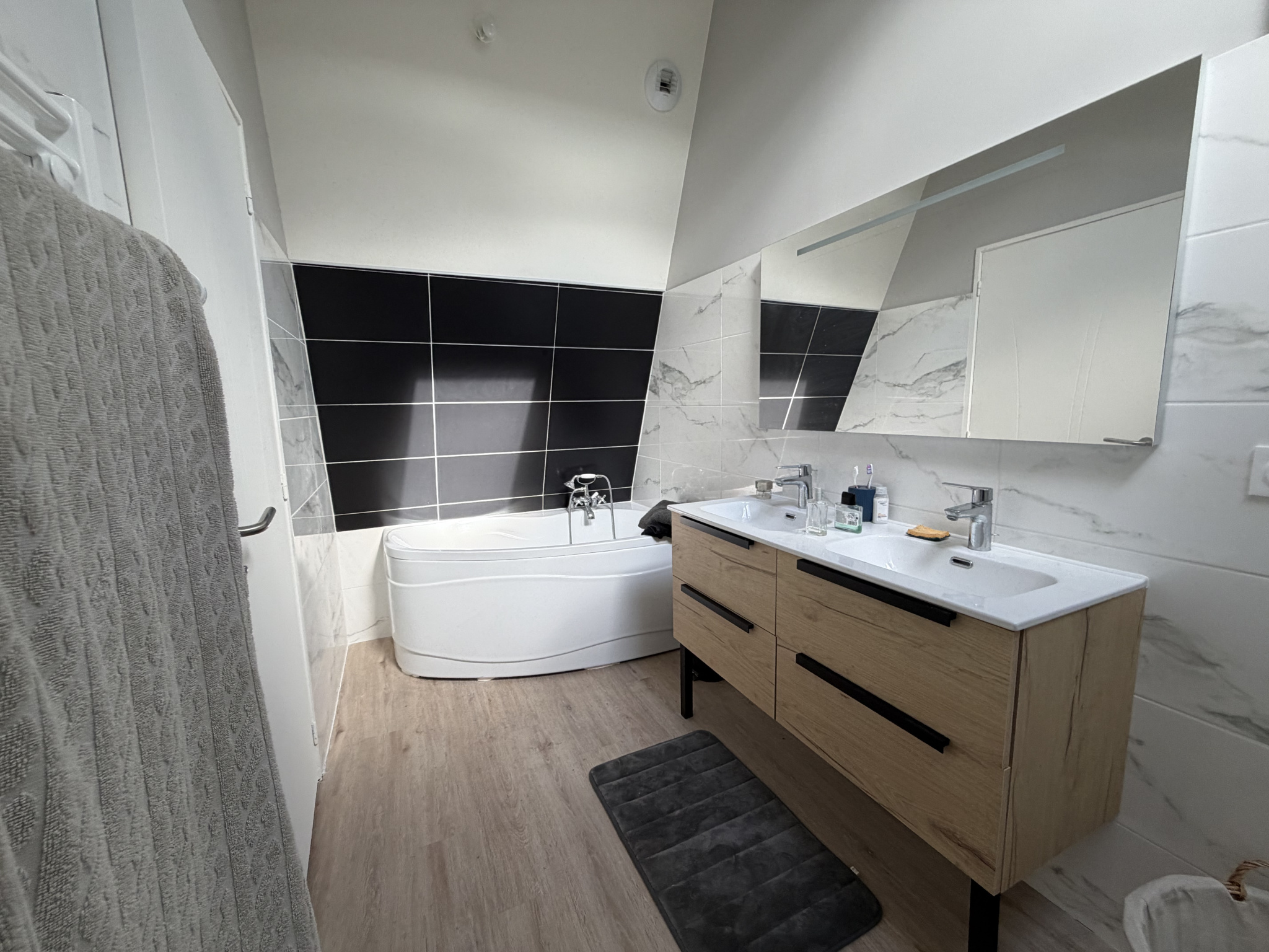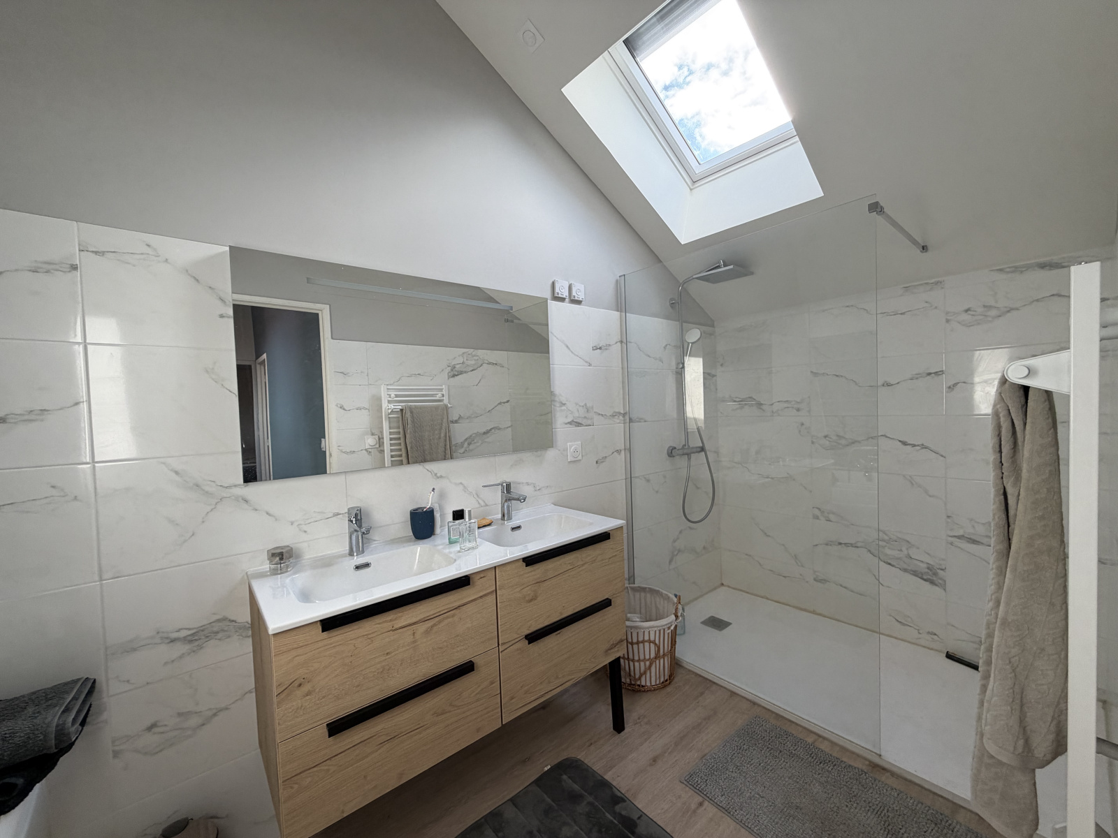 Deux escaliers mènent à 2 espaces nuits bien distincts, d'un côté une suite parentale avec sa douche italienne, son meuble une vasque avec miroir. De l'autre côté, 2 chambres avec une autre salle de bains avec douche italienne, son meuble double vasques avec miroir.