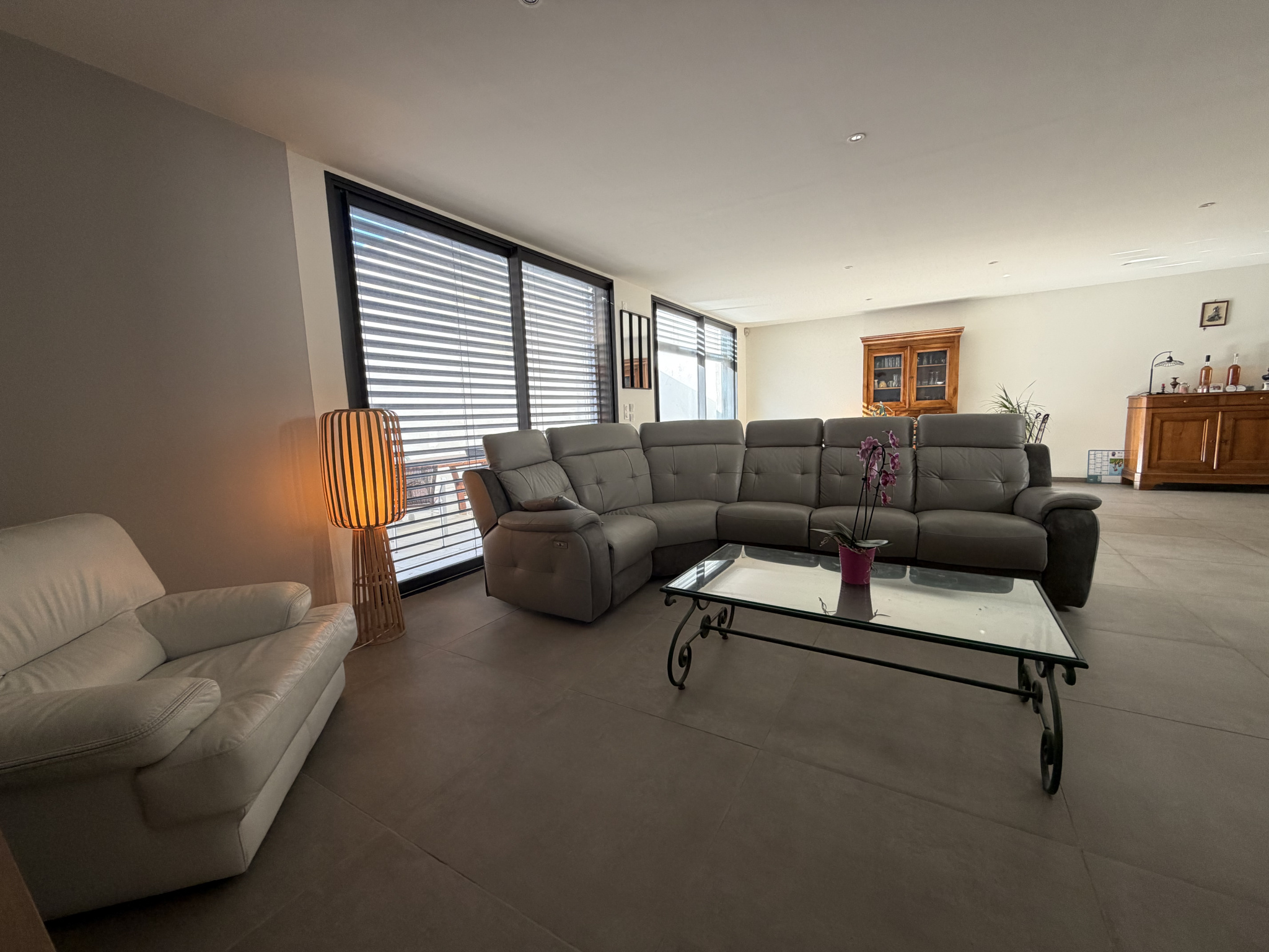 Riorges (42153)ROANNE - L'IMMOBILIERE 42 vous présente cette maison de ville esprit "LOFT" lumineuse avec ses beaux volumes. Un hall cossu avec placards comprenant un WC supsendu, donne accès sur une spacieuse pièce de vie, avec lumière traversante, d'environ 80 m2 avec cuisine américaine entièrement équipée, le salon séjour avec de grandes baies en aluminium équipées de BSO (Baies Solaires Orientables) a un accès direct à une terrasse privative d'environ 34 m2, sans vis à vis.