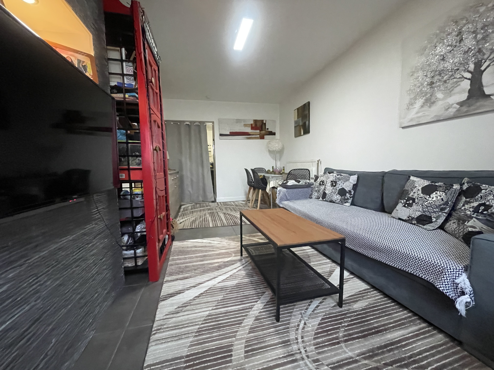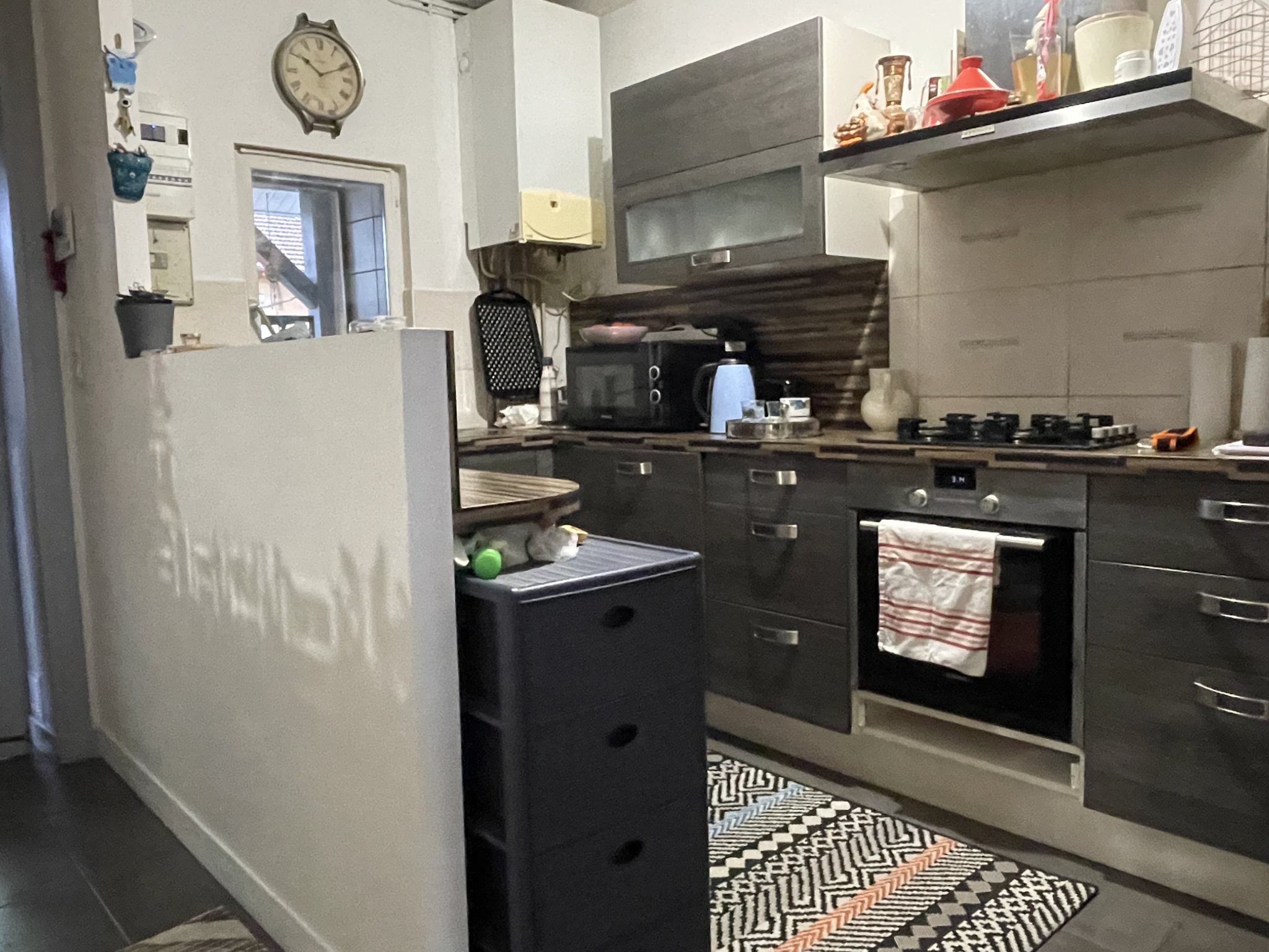 Au premier étage, l'appartement a été entièrement rénové avec une cuisine équipée ouverte, une pièce de vie, 2 chambres, une salle de bains avec un meuble une vasque et un WC suspendu.