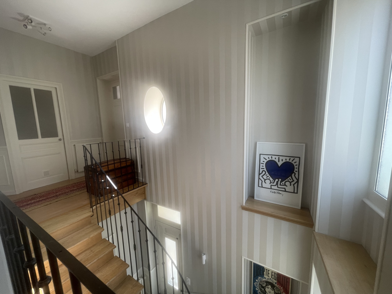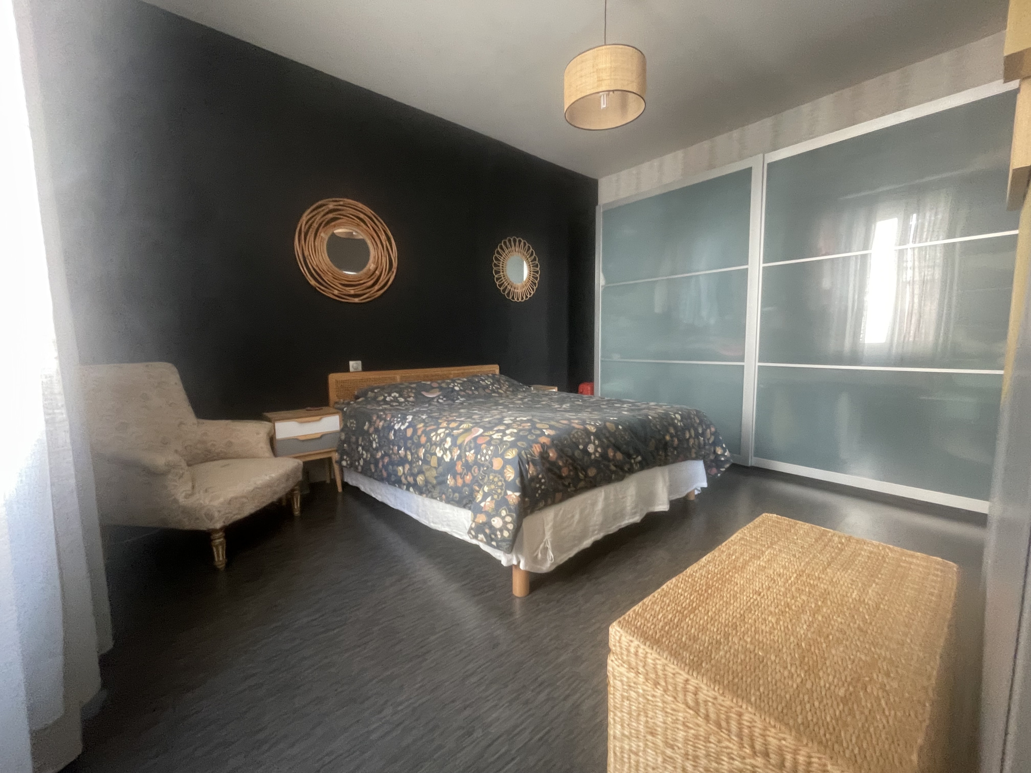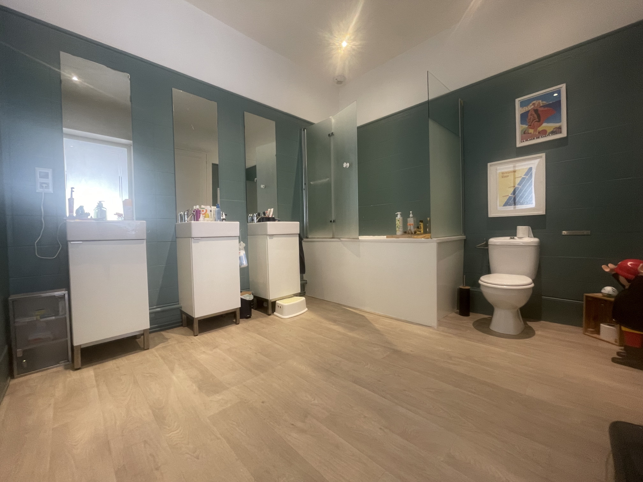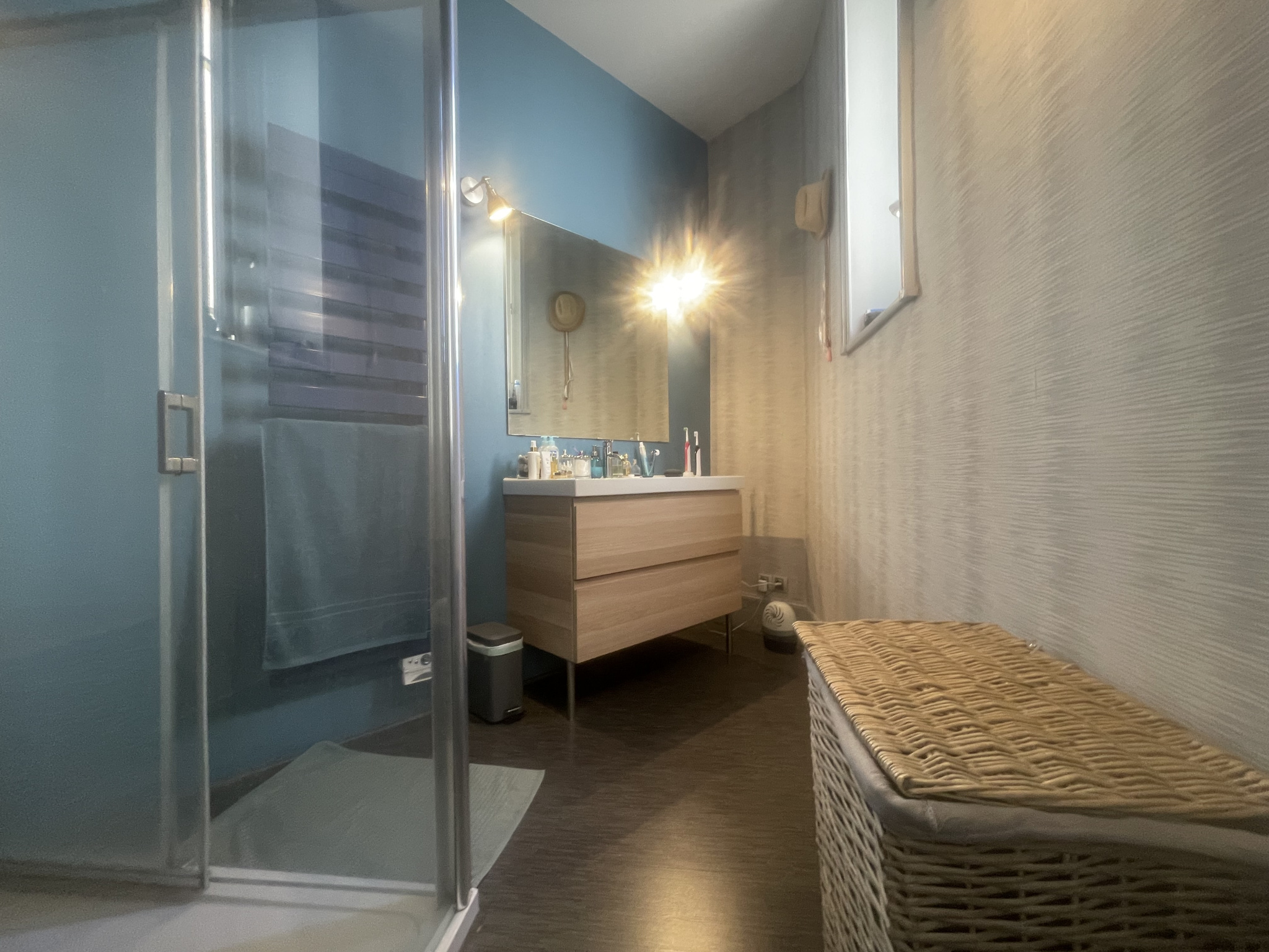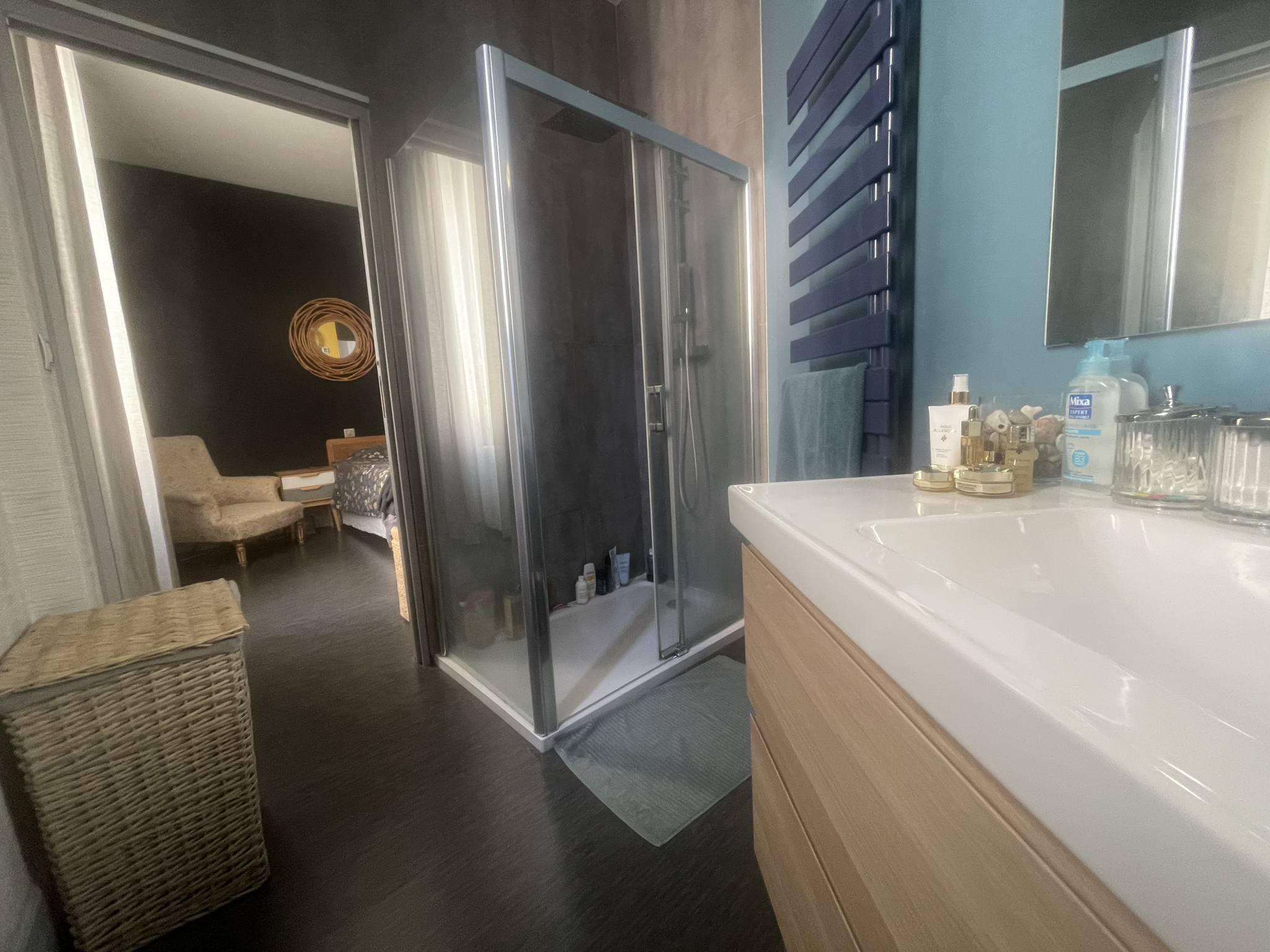 L'étage offre 3 chambres spacieuses alliant le charme de l'ancien et un confort optimum dont une avec une pièce de rangement attenante, une salle de bains avec ses 3 vasques, son placard et son WC.